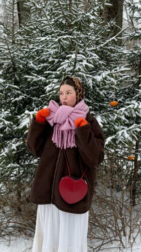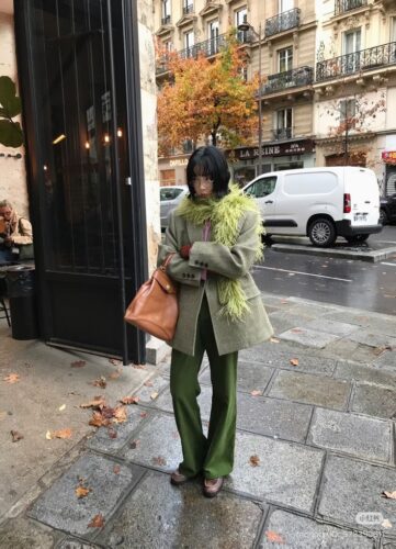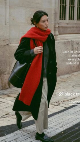 こちらのようにポイントになるカラーのマフラーを大きめの巻き方で取り入れることで、スタンダードな巻き方でもマフラーがカラーポイントとなり、アウターとのバランスを取ることができます。