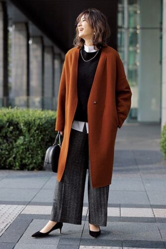 カラー紹介したブラウン系に重ね着をして防寒とおしゃれを兼ね備えたコーデ。